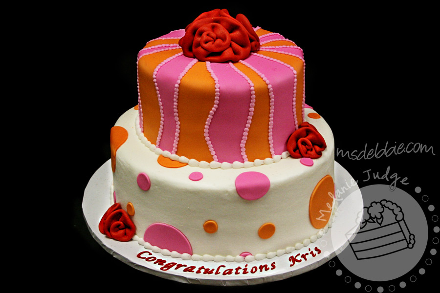 This cake was iced in buttercream and decorated with wavy fondant stripes on the top tier and fondant polka dots on the bottom tier. Then we added bunches of red ribbon roses on the top and sides of the cake.